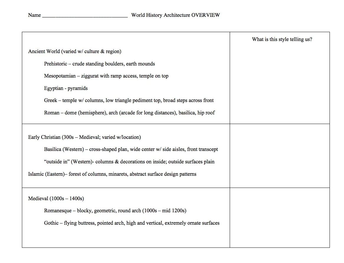 This graphic organizer is set up to accompany the timeline as presented in the Architecture Is Elementary text, though it could be used independently. Here is a single-page sample: